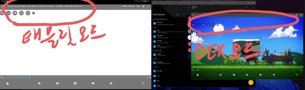 상단은 태블릿모드의 mxplayer 화면이고 하단은 Dex 모드의 mxplayer 화면 이다